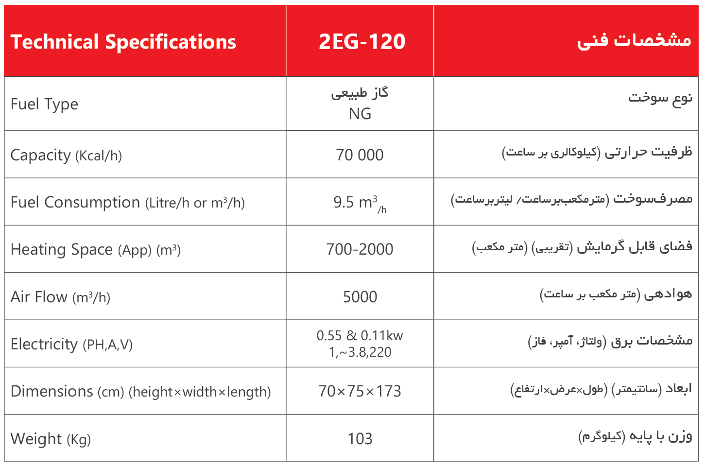 توان حرارتی دستگاه 70 هزار کیلوکالری در ساعت با حجم هوادهی 5000 مترمکعب در ساعت میباشدکه قابلیت گرمایش فضای تقریبی 2000-700 مترمکعب را دارا است.
