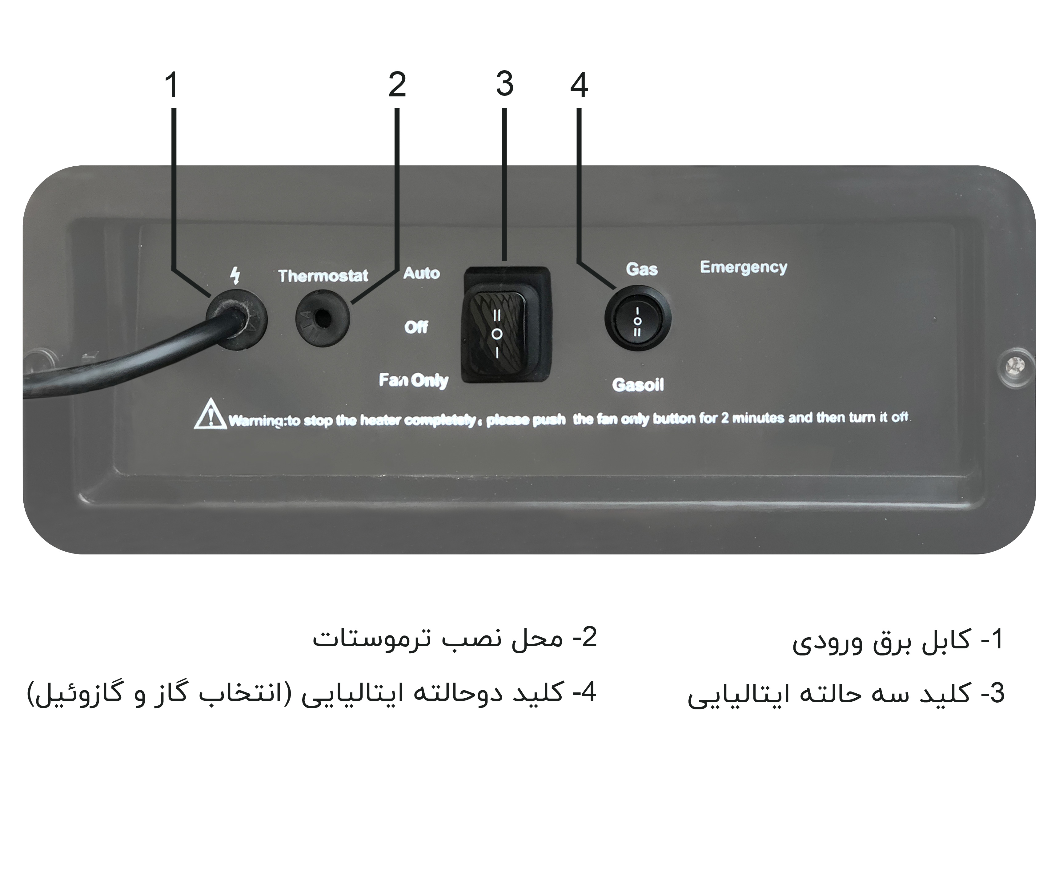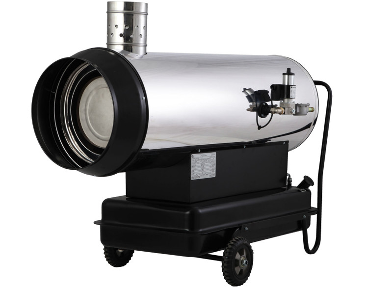 این دستگاه قابلیت استفاده همزمان از هر دو نوع سوخت گاز شهری (NG) و گازوئیل را دارا می باشد و مجهز به سیستم ایمنی فلوسوئیچ و شیر کنترل گازی میباشد. این دستگاه به لحاظ وجود دودکش امکان خروج گازهای آلاینده از محیط را فراهم کرده است، بطوری که گرمای مطبوع و سالم را ارائه می دهد . علاوه بر موارد ذکر شده وجود مخزن 100 لیتری گازوئیل دستگاه امکان پرتابل بودن آن را فراهم کرده است . نشانگر سطح سوخت روی باک، میزان سوخت داخل مخزن را نشان می دهد که در صورت وجود کاهش می توان مجددا آنرا پر نمود.