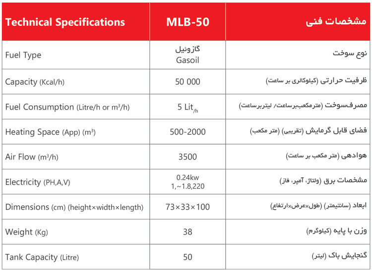 جت هیتر گازوئیلی باکدار البرز مدل MLB-50 از سری مینی هیترهای البرز می باشد که با سوخت گازوئیل کار میکند، میزان مصرف سوخت دستگاه 5 لیتر در هر ساعت با توان حرارتی 50 هزار کیلوکالری بر ساعت می باشد. حجم هوادهی دستگاه حدودا 3500مترمکعب بر ساعت بوده که قابلیت گرمایش فضا به ابعاد 2000-500 متر مکعب را دارد. این دستگاه برای استفاده در فضاهایی مانند پروژه های ساختمانی ، راهسازی، معادن، سالن های صنعتی و تولیدی و دامداری ها مناسب می باشد.